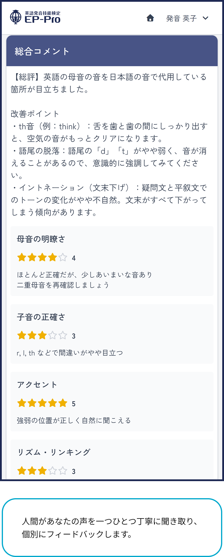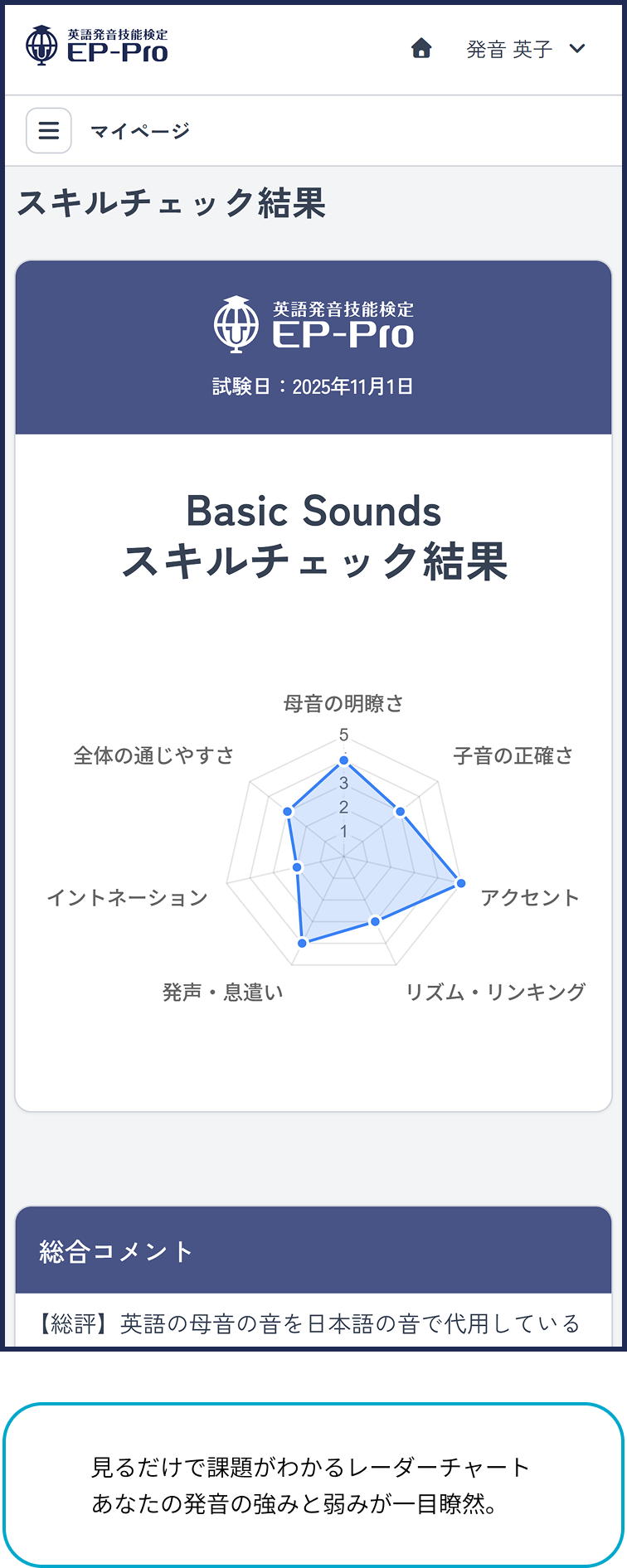 EP-Proスキルチェックは、あなたの発音における「今の状態」と「これからの課題」を、